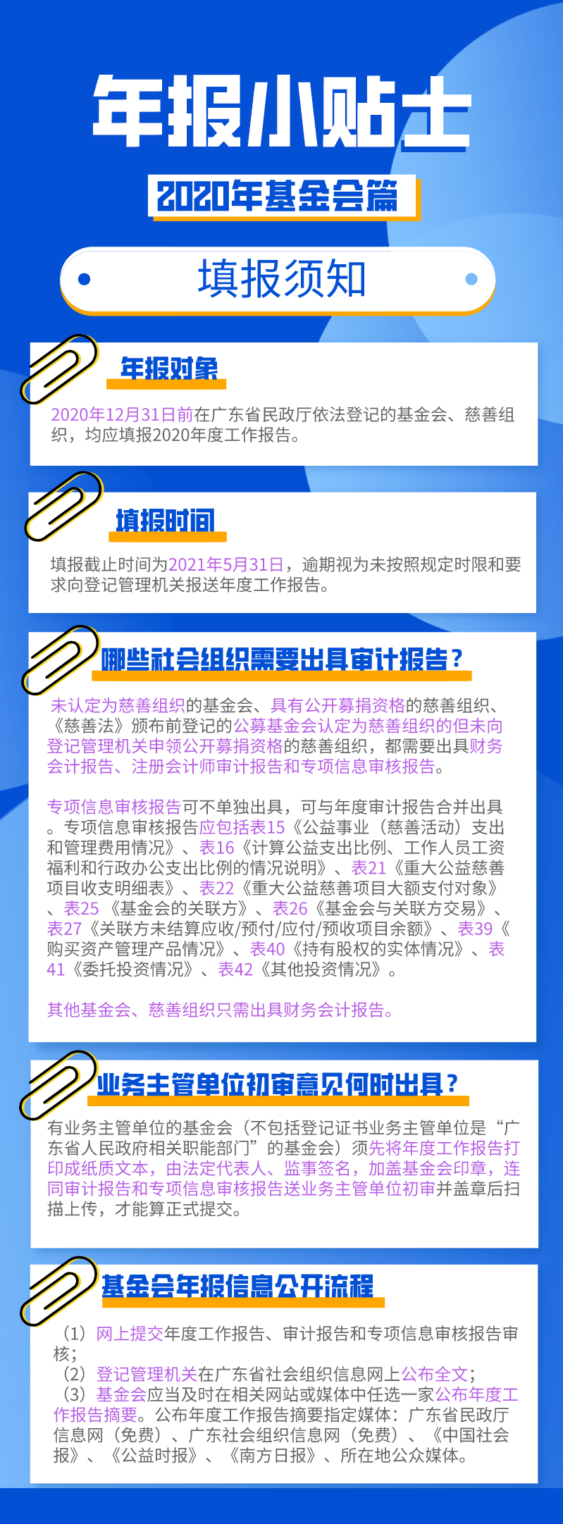 为进一步推进全省性社会组织填报2020年度工作报告,现围绕填报中常见问题,制作了基金会“年报小贴士”供指引。