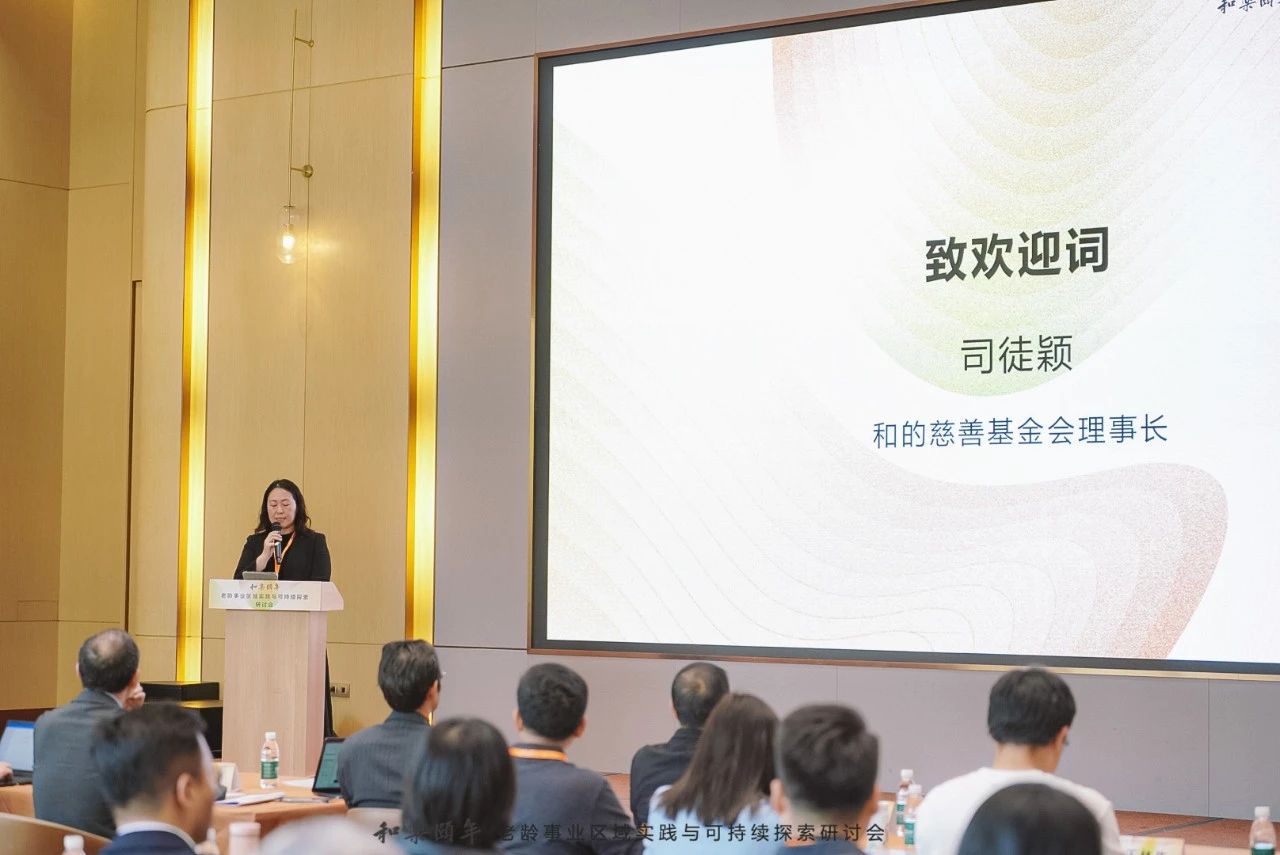 首先,和的基金会理事长司徒颖向全国各地到访的嘉宾伙伴致欢迎词,向大家介绍了和的基金会在老龄议题中的实践探索,并特别介绍了即将正式运营的和祐国际医院将更专业地持续赋能养老事业。司徒颖理事长希望能够与更多来自全国的行动伙伴持续互动交流,共同促进老龄领域中的经验分享与合作实践。