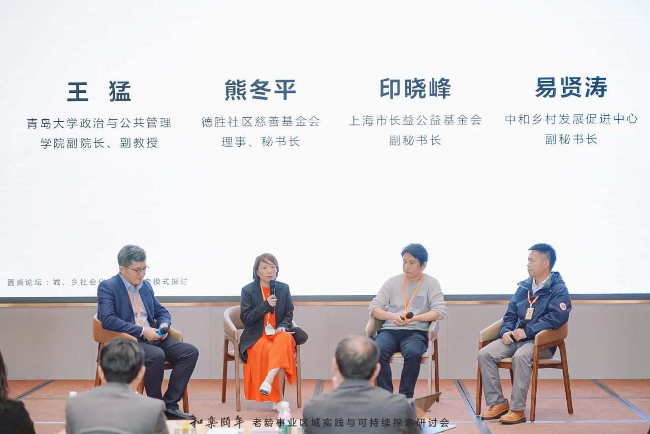 随后,在王猛教授的主持下,广东省德胜社区基金会秘书长熊冬平、上海市长益公益基金会副秘书长印晓峰、中和乡村发展促进中心副秘书长易贤涛参与了讨论,大家从资金、人才以及服务可持续等方面阐述了各自的实践经验与思考。熊冬平秘书长分享了近期在顺德地区关于老龄相关的调研,提到在城镇老龄工作也需要开始转变思路和方法,特别是在资金筹集方面的思路;印晓峰秘书长分享了长益基金会在农村地区的工作经验,在发展农村助老员方面的多方共建的经验;易贤涛副秘书长主要从如何扩大集体经济的思路去保障资金的可持续。