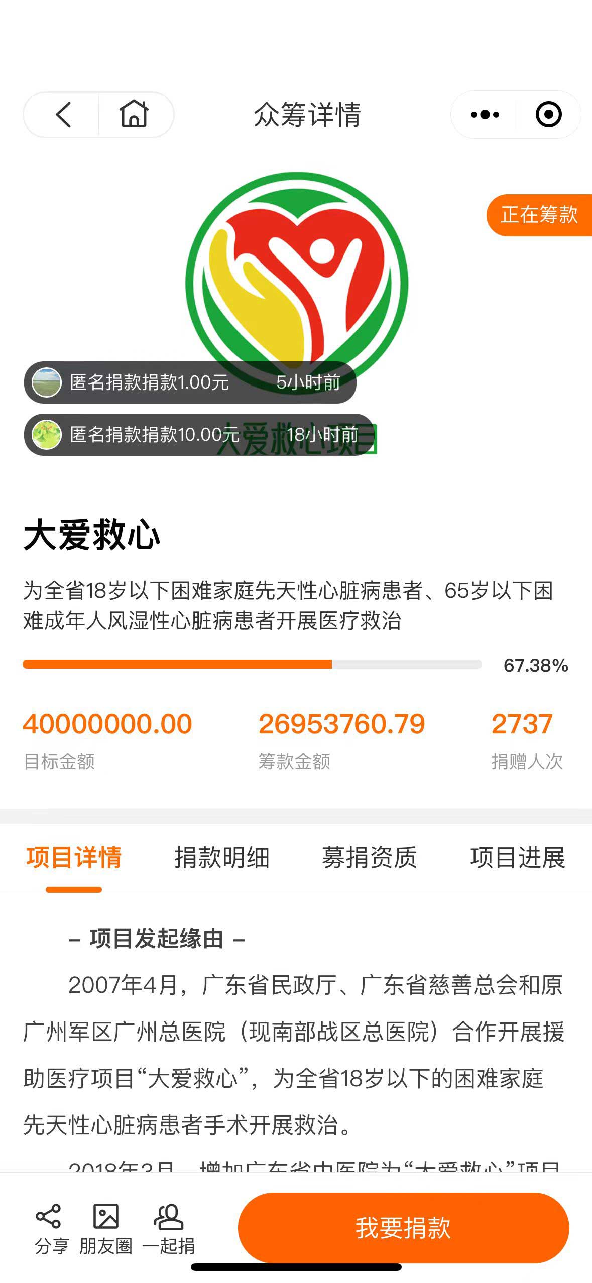 点击【我要捐款】或选择下方的“推荐项目/基金”区域进入想要捐赠的项目的详情页面。