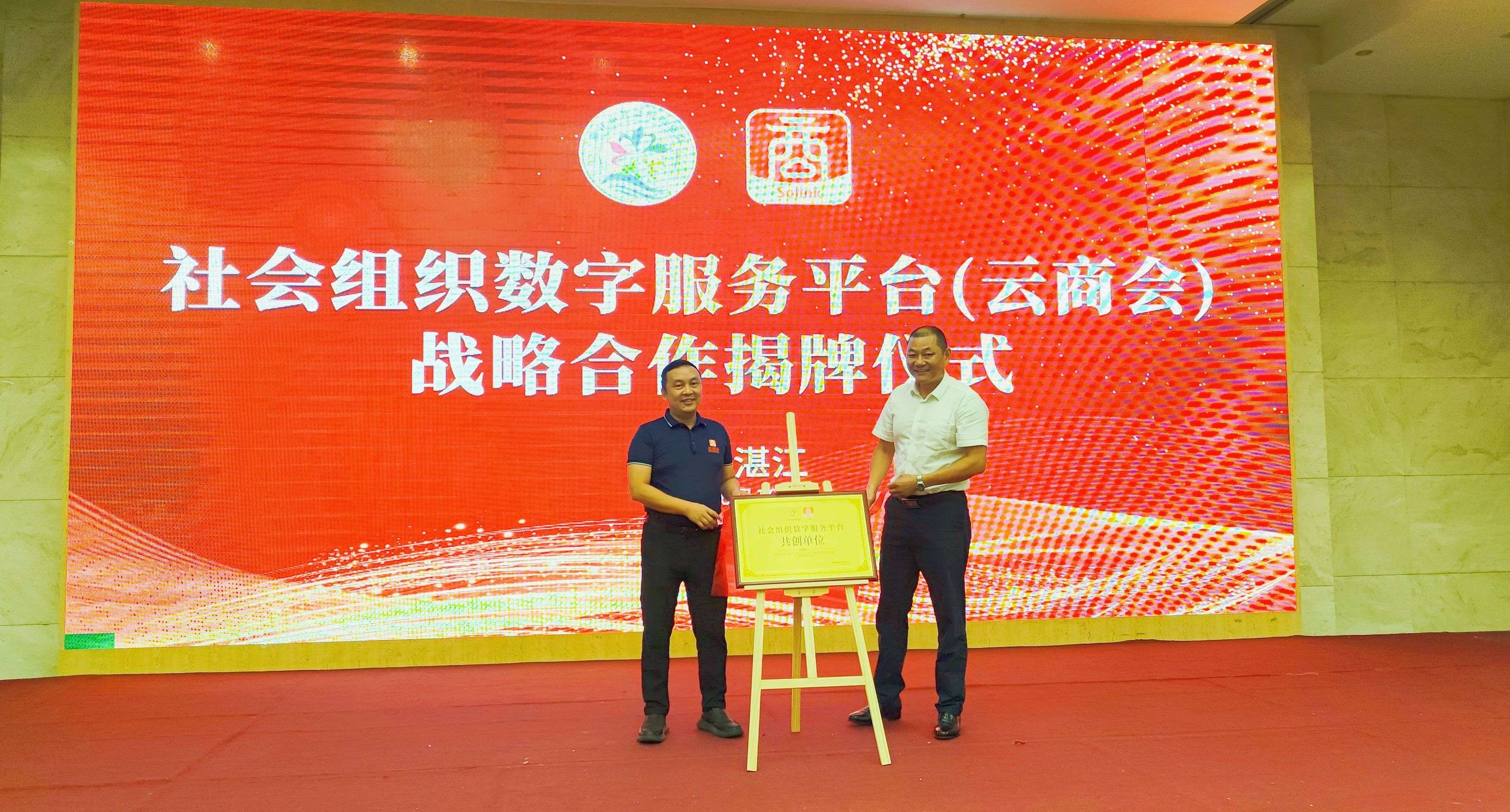 会上,为进一步助力湛江市社会 组织数字化转型,湛江市社会组织总会与社会组织数字服务平台(云商会)达成战略合作,詹建中会长与丁建斌总经理作为双方代表上台,签订战略合作书并为战略合作揭牌。
